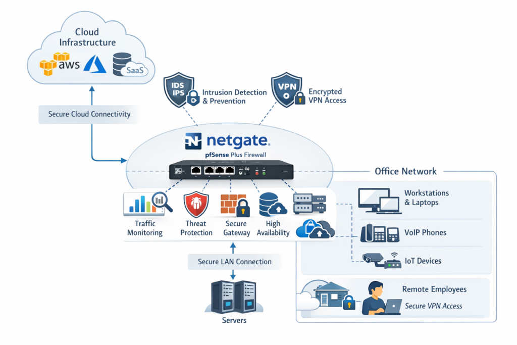 This architecture demonstrates how Netgate pfSense firewall protects cloud infrastructure, office networks, servers, and remote employees through secure VPN connectivity, intrusion detection, and advanced traffic monitoring.